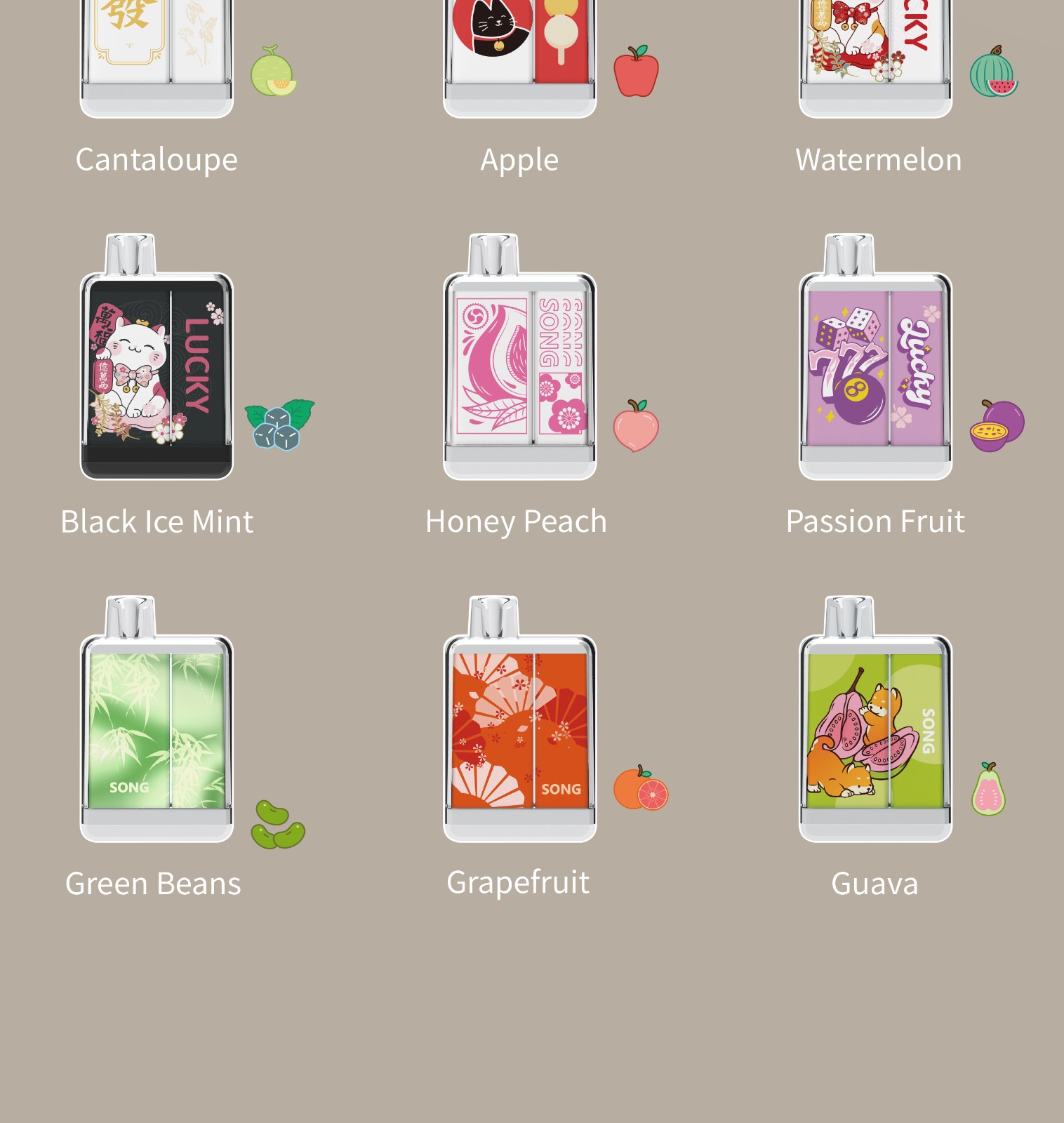 Cantaloupe/Black Ice Mint/Cola/Litchi/Longjing Tea/Lemon/Apple/Grape/Green Grape/Watermelon/Green Beans/Passion Fruit/Honey Peach/Grapefruit/Guava