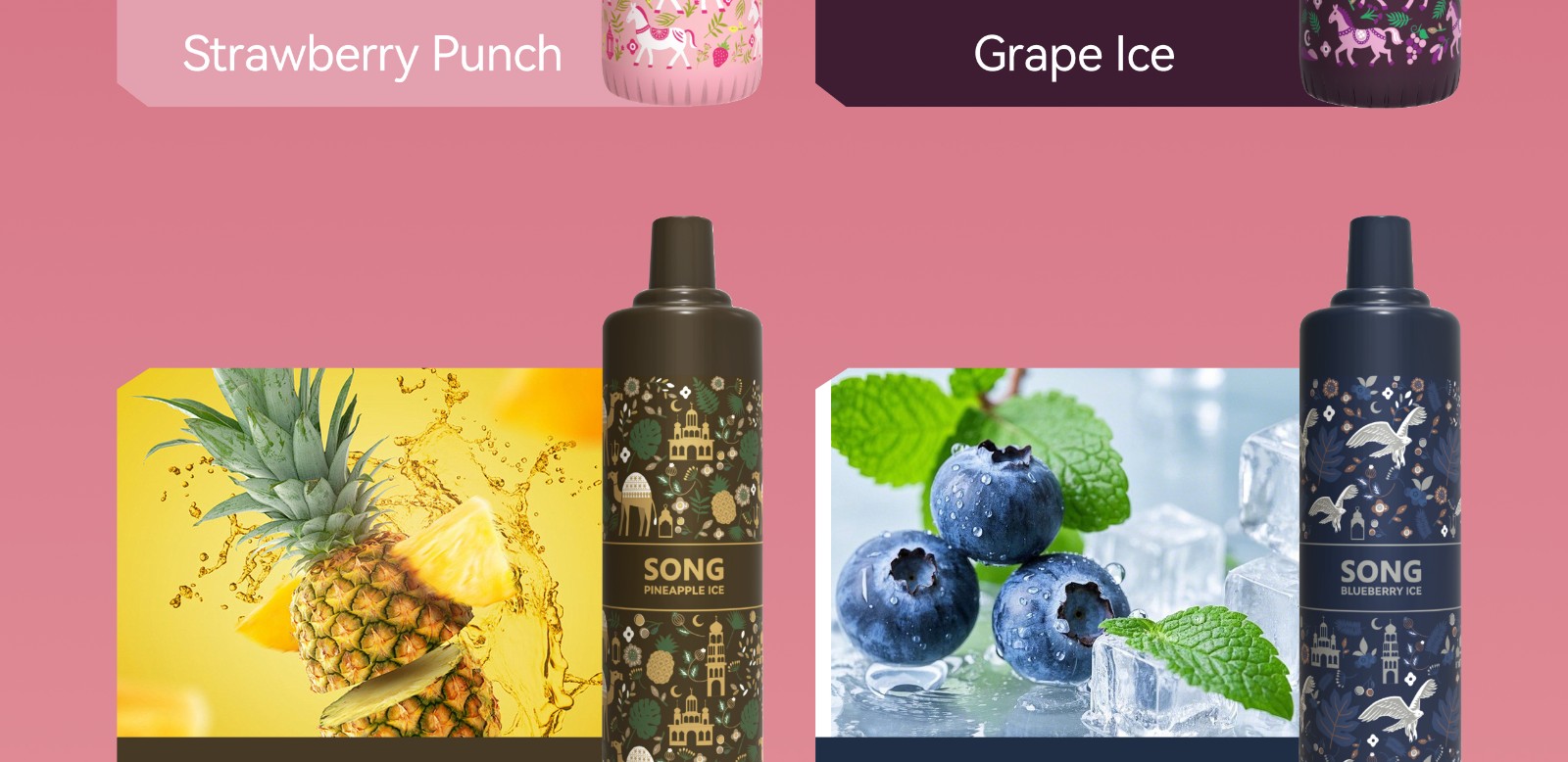 Peach Ice/Magical Love/Strawberry Punch/Grape Ice/Pineapple Ice/Blueberry Ice/Perfume Lemon/Miami Mint/Watermelon Ice/Mango Juice